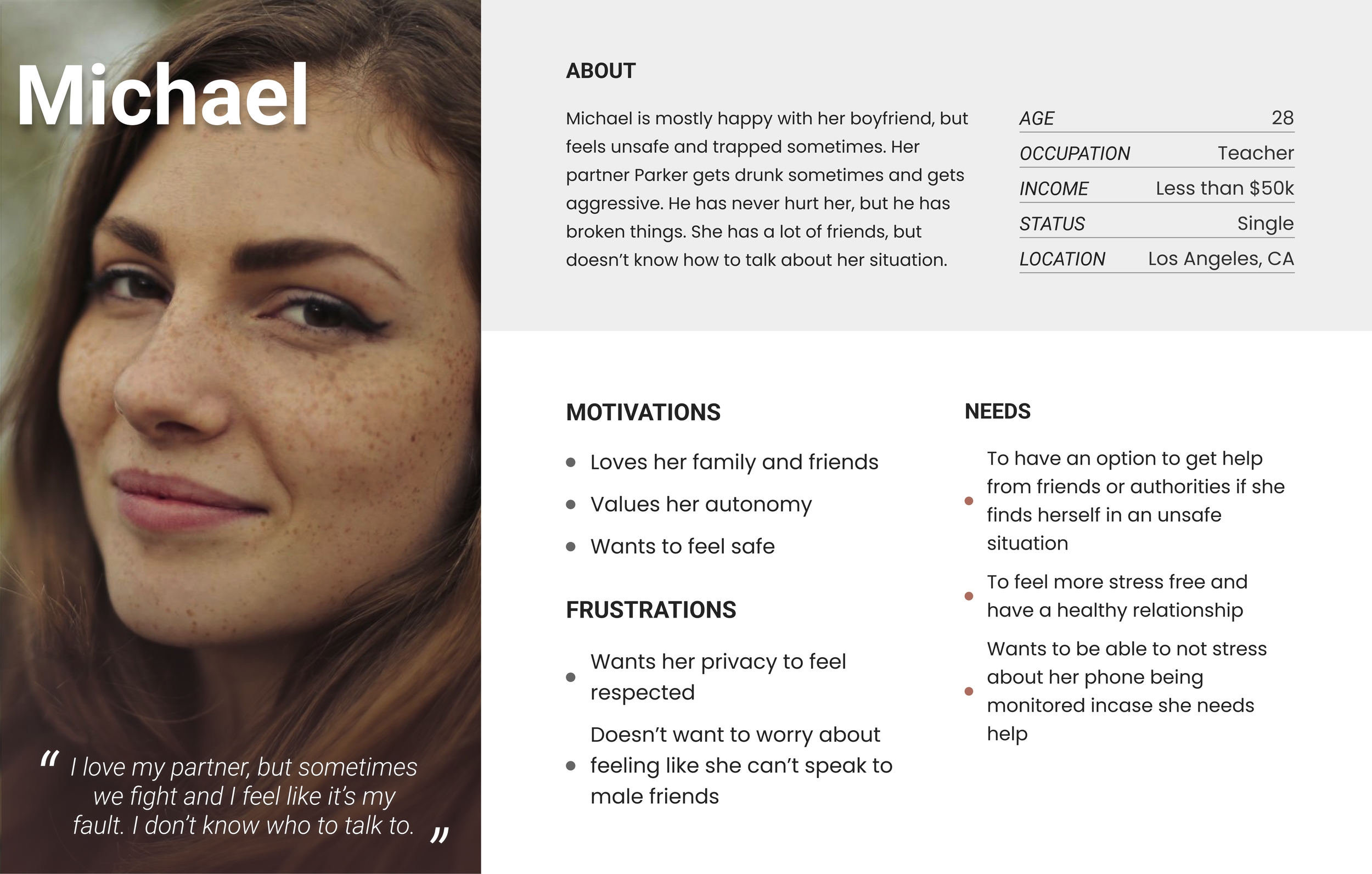 Based on the survivor stories and the competitor apps, I created a persona to help the team build empathy and guide our design strategy for our target user demographic.