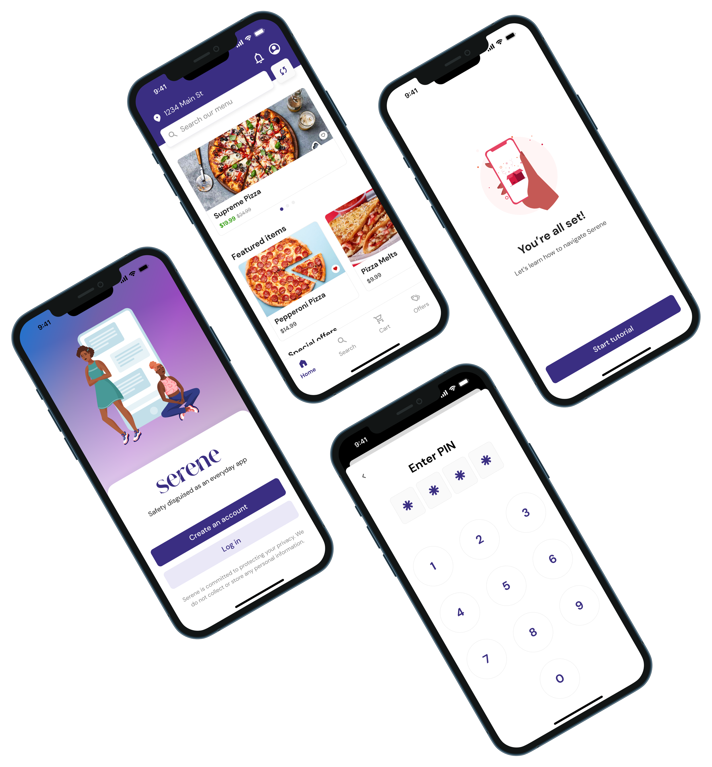 Discreet UI, posing as an e-comm app, featuring a hidden panic button.